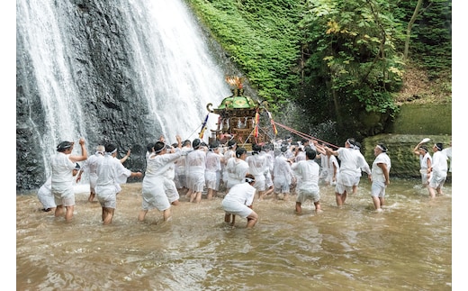 毎年8月1日の白瀑神社例大祭に行われ、白装束の男衆が町内を練り歩いた後、みこしを担いだまま滝つぼに入る勇壮な神事。