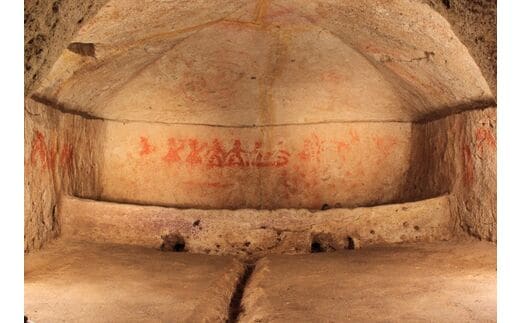 絵画の内容は、人物や馬などの動物、渦巻きなどの幾何学模様で、横穴墓の玄室と呼ばれる部屋の壁面や天井など、いたる所に描かれています。