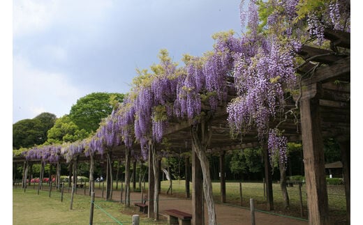 県立多々良公園の藤棚は長さ130mあり、毎年4月下旬からゴールデンウィーク始めに見ごろを迎えます。