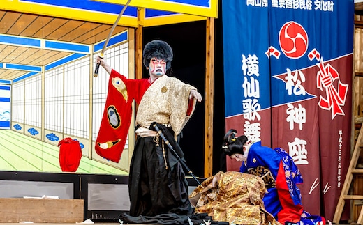 横仙とは奈義町の辺りを指す古い地名で「山の横」という意味です。この地方では古くは山を“仙(せん)”と呼びました。横仙歌舞伎は江戸時代から奈義町に伝わる伝統芸能です。地下芝居(じげしばい)とも呼ばれ、農村の数少ない娯楽として、そして地域の絆を深める年中行事として、今も多くの人々によって伝承。春秋の定期公演の他、県内外への出張公演、慰問公演なども積極的に行っています。