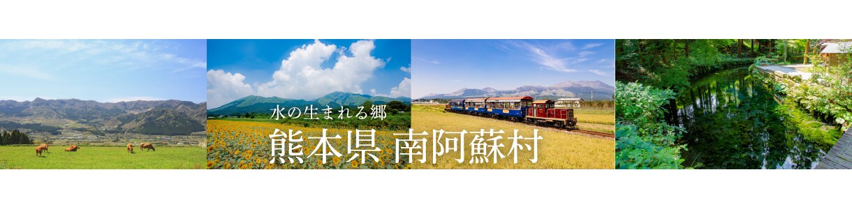 阿蘇カルデラは世界最大級の大きさを誇り、カルデラの中に人が暮らし、鉄道まで走っているのは非常に珍しく“世界一のカルデラの村”として観光地にもなっています。田園広がる絶景のパノラマや、豊かな湧水で作られる美味しい野菜やお米、そして阿蘇の草原でのんびりと育つあか牛が自慢です。