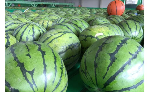 益城町のスイカは収穫時期が早いことで知られ、11月から6月までに収穫されます。昼夜の自然の寒暖差を利用した「エコ栽培」。糖度が高く肉厚の高品質なスイカが生産され、最新鋭の選果場で、大きさ、糖度などが管理されたのち、日本全国へと出荷されます。