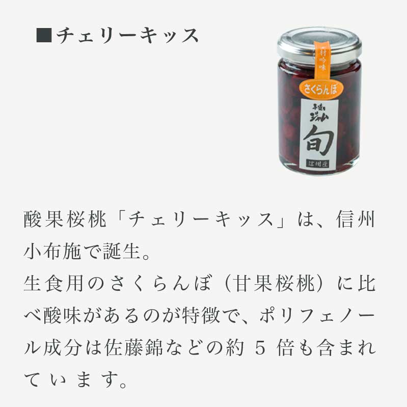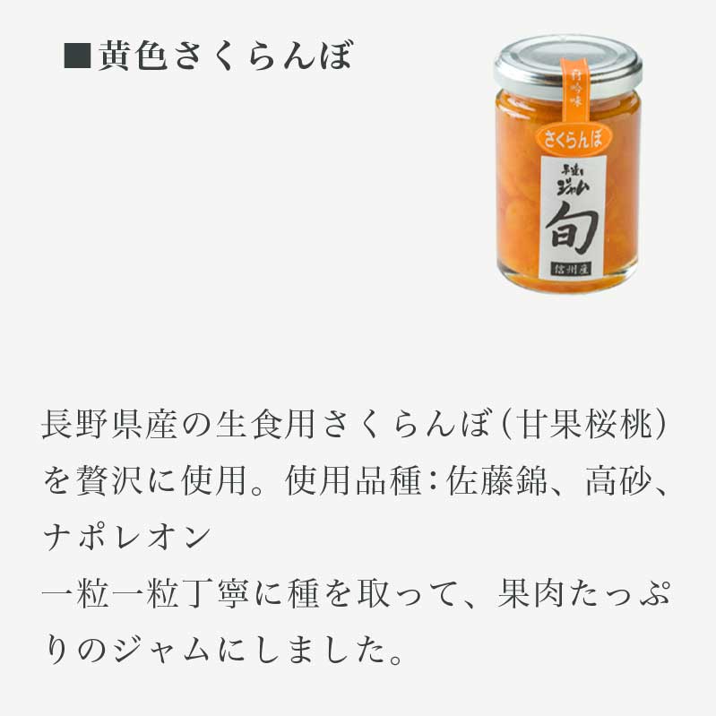 ■長野県産の生食用さくらんぼ(甘果桜桃)を贅沢に使用。使用品種:佐藤錦、高砂、ナポレオン一粒一粒丁寧に種を取って、果肉たっぷりのジャムにしました。