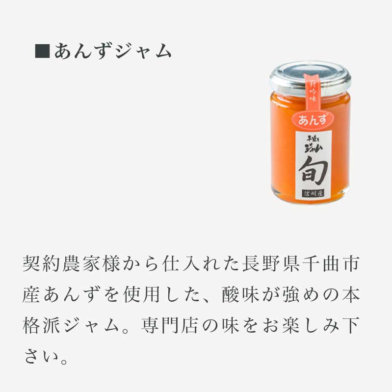 ■契約農家様から仕入れた長野県千曲市産あんずを使用した、酸味が強めの本格派ジャム。専門店の味をお楽しみ下さい。