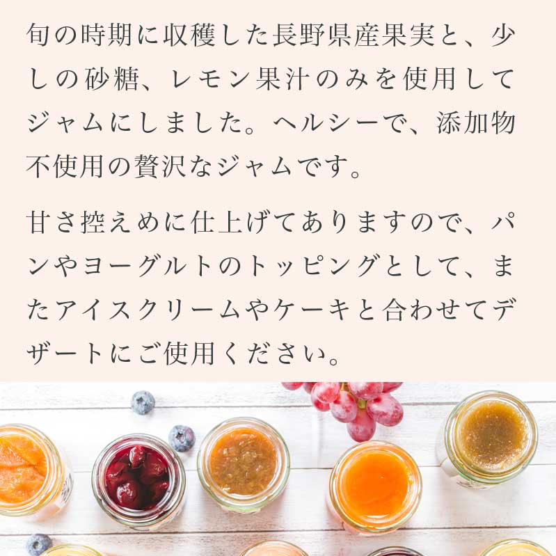 旬の時期に収穫した長野県産果実と、少しの砂糖、レモン果汁のみ使用しました。ヘルシーで、添加物不使用の贅沢なジャムです。甘さ控えめに仕上げてありますので、パンやヨーグルトのトッピングとして、またアイスクリームやケーキと合わせてデザートにご使用ください。
