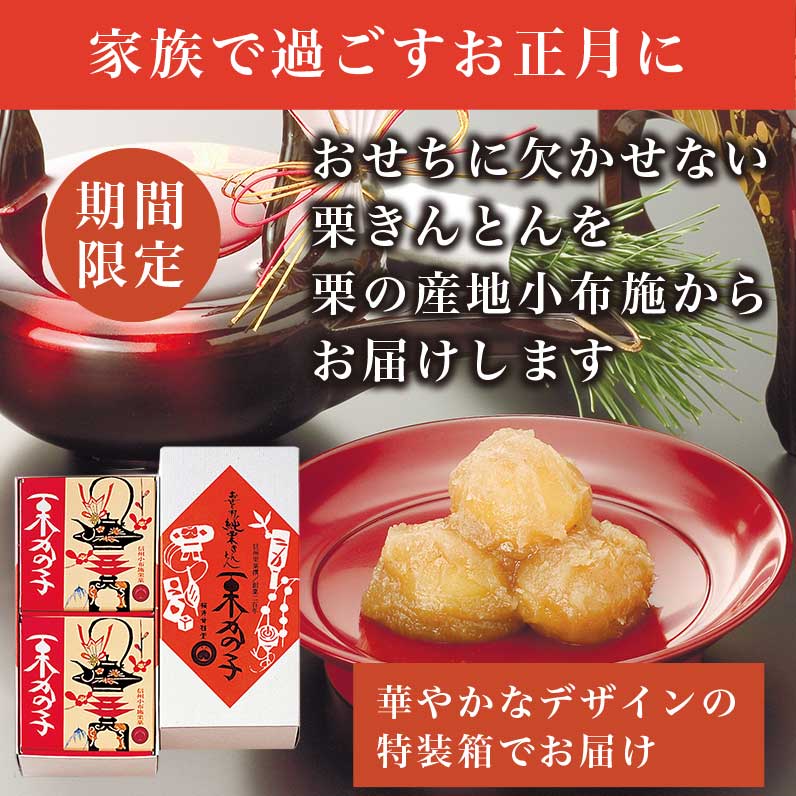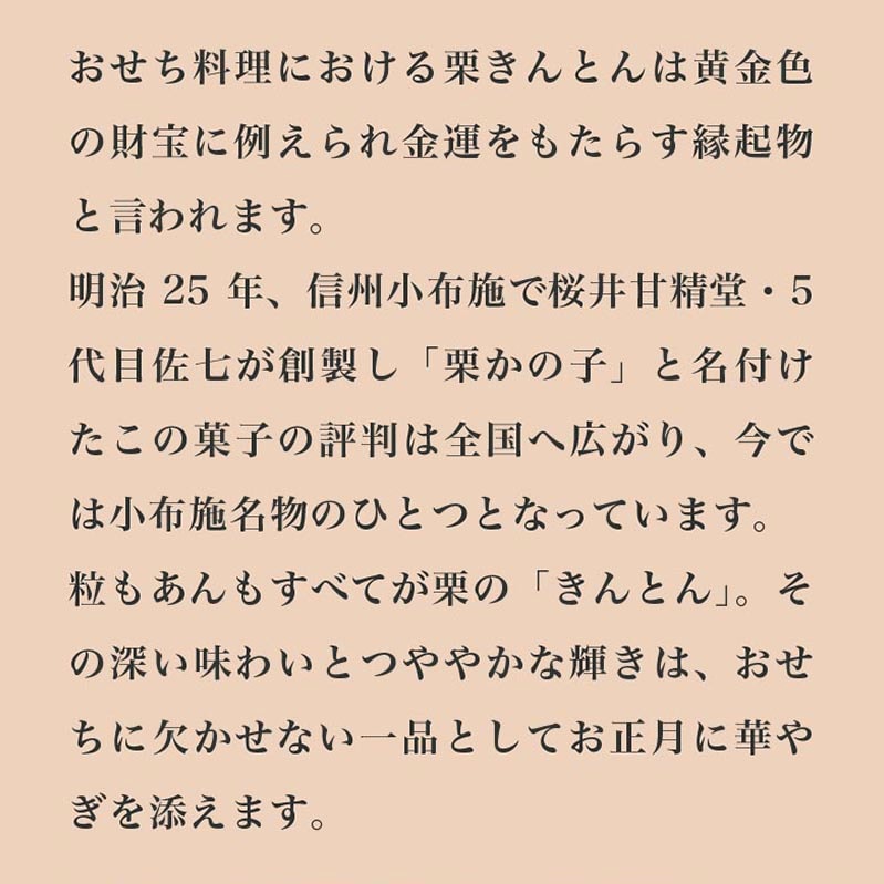 おせち料理における栗きんとんは黄金色の財宝に例えられ金運をもたらす縁起物と言われます。明治25年、信州小布施で桜井甘精堂・5代目佐七が創製し「栗かの子」と名付けたこの菓子の評判は全国へ広がり、今では小布施名物のひとつとなっています。粒もあんもすべてが栗の「きんとん」。その深い味わいとつややかな輝きは、おせちに欠かせない一品としてお正月に華やぎを添えます。