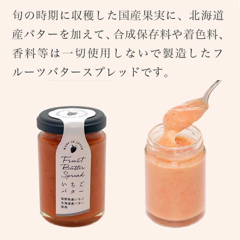 旬の時期に収穫した国産果実に、北海道産バターを加えることで、トーストに塗るとバターが溶け出します!甘さ控えめに仕上げてありますので、トーストや、ベーグルなどにたっぷり塗ってお召し上がりください。