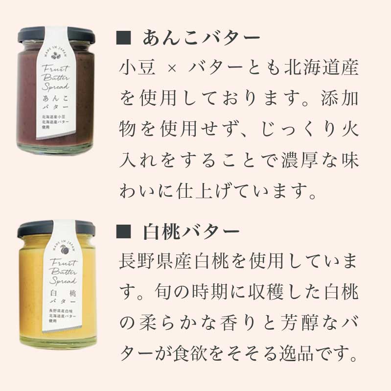 ・りんごバター140g×1本 ・いちごバター140g×1本 ・あんこバター140g×1本 ・白桃バター140g×1本