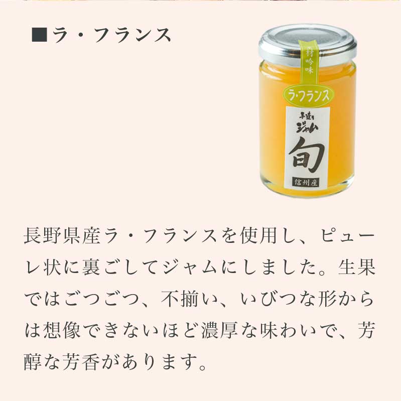 ■長野県産ラ・フランスを使用し、ピューレ状に裏ごしてジャムにしました。生果ではごつごつ、不揃い、いびつな形からは想像できないほど濃厚な味わいで、芳醇な芳香があります。