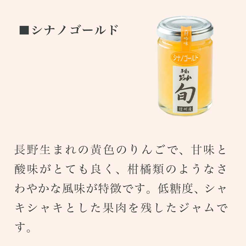 ■長野生まれの黄色のりんごで、甘味と酸味がとても良く、柑橘類のようなさわやかな風味が特徴です。低糖度、シャキシャキとした果肉を残したジャムです。