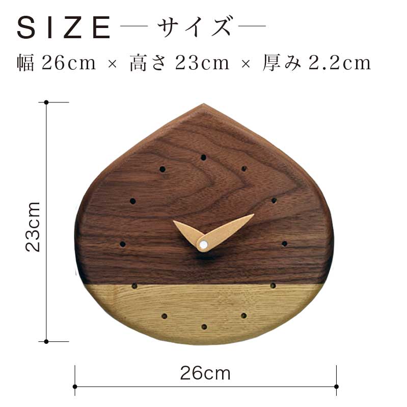 【内容】 栗時計 1台 【材種】 ウォールナット・メープル 【仕上げ】 オイル仕上げ 【サイズ】 幅260mm × 高さ230mm × 厚み 22mm