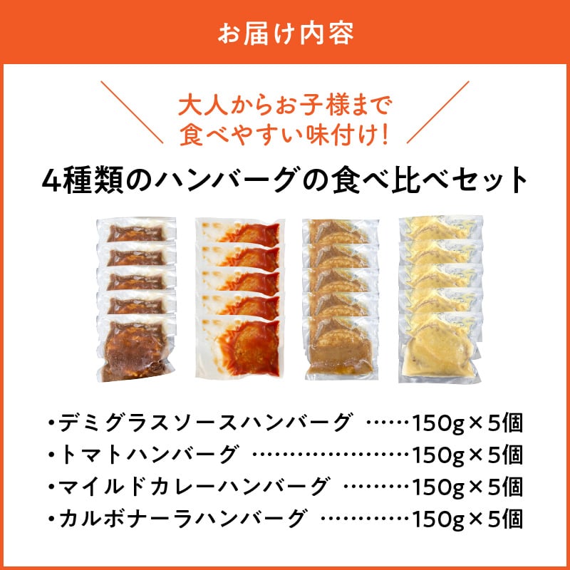 ・デミグラスソースハンバーグ150g×5個 ・トマトハンバーグ150g×5個 ・カレーハンバーグ150g×5個 ・カルボナーラハンバーグ150g×5個